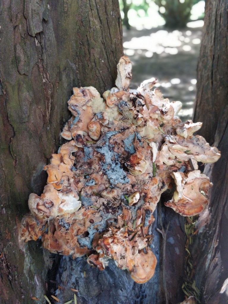 Laetiporus sulphureus, so-called ‘chicken of the woods’ is an interesting fungus that grows mainly on deciduous trees; including oak, sweet chestnut and beech. It is prized by foragers. A good friend alerted me to a brilliant example on a yew tree, an outlier to the deciduous tree ‘rule’, just over a year ago (25th May 2021), a gorgeous undulating bright specimen, with some interesting glowing blue mould colonising it. A couple of weeks later I was able to visit the tree myself, in the National Botanic Gardens in Glasnevin and the Laetiporus was degraded and looking a bit shabby. I am so intrigued at what this blue mould was and what effect it’s had. Correlation does not equal causation, but what is this blue mould, what effect did it have? What’s it doing to the yew tree, is it protecting it? Colonising it for itself? Laetiporus sulphureus is known to be saprobic itself, meaning it grows on dying or dead hardwood, to know and understand the role of this mould would unlock some secrets of this fascinating interaction.
