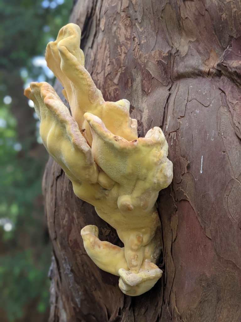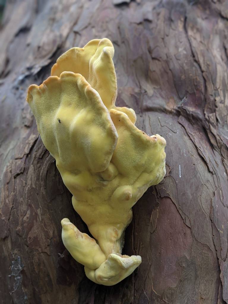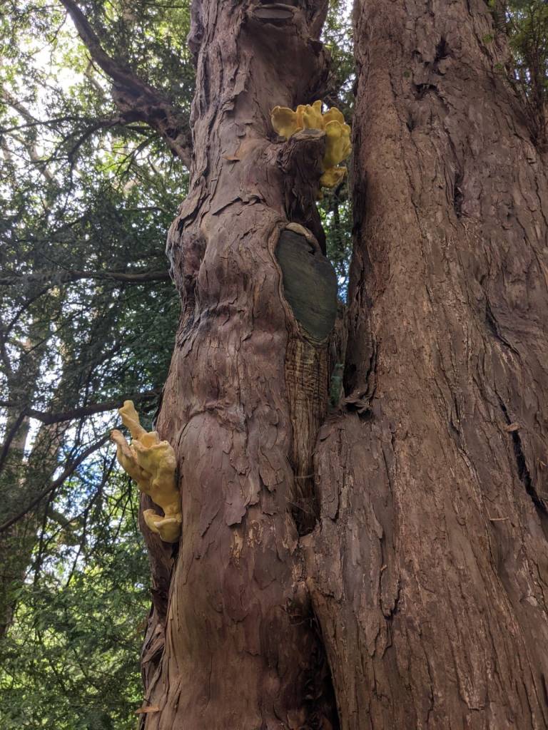 A nearby, older yew sprouts a young and prime example of Chicken of the Woods, closer off the garden’s ground. Thanks so much to Katie for the photos – it always makes me happy when friends share their fungal finds with me!