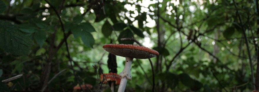 So I set off one September evening, over a small bridge and through a gap in a fence and onto Willow Bank I wandered, following a rough public footpath. Trees hugging the path, framing evidence that horses frequently use the track, and quickly opening up to a clearing. My steps were attempting to be careful and slow, taking in the oasis of calm and ruggedness and trying to overcome the habitual ‘a to b’ nature of my walking, of speed and having a destination. Enjoying the time and space to be curious, I came off the path and into a cluster of trees at the bottom of the bank. I ducked under some low hanging branches, following my intuition. And there, amongst holly, brambles and leaf litter, the most beautiful family of fairytale mushrooms. Various ages, some nibbled by wildlife, some young and domed; some older, their caps flattened, paler, split and wrinkled in parts. Velar remains on each ruby red cap, and the most exquisite ring, looking pleated with little teeth hanging from the edges as if it was the edge of some handcrafted tablecloth. These were Amanita muscaria, as if right out of a children’s fairytale book.