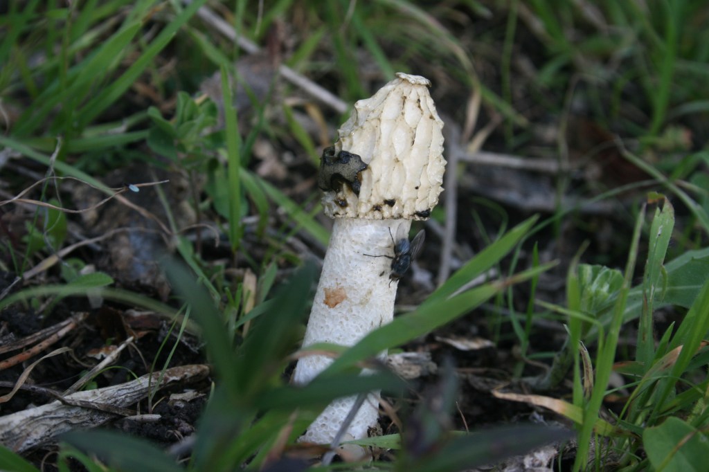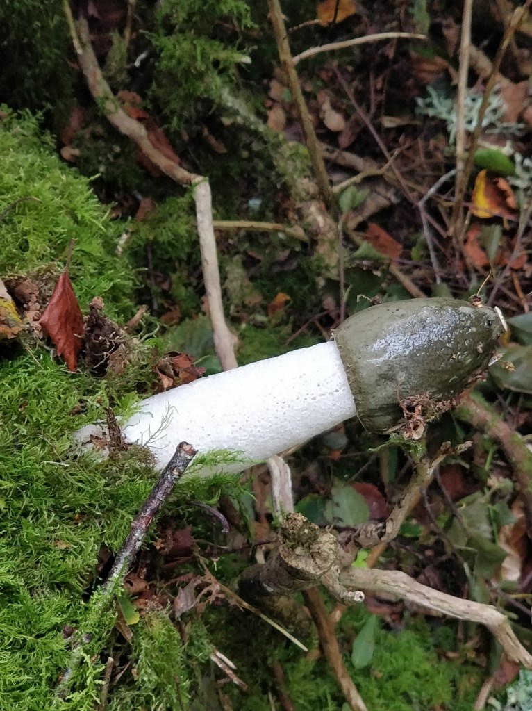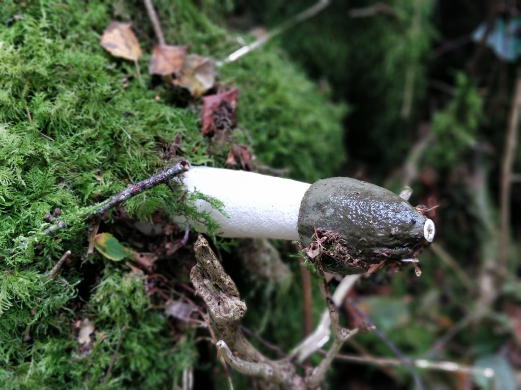 It first emerges from the ground as egg shaped, and at this immature stage they are eaten as a delicacy – although apparently still emit a pungent smell at this stage thought not quite as strong as the mature form. As they break out of the egg stage the tip can be seen covered in the green-ish brown ‘gleba’ which contains the spores. Flies are attracted to this whiffy, sticky substance, landing on it and consuming it, sticking the spores to their feet and spreading the spores when they fly on their merry way.