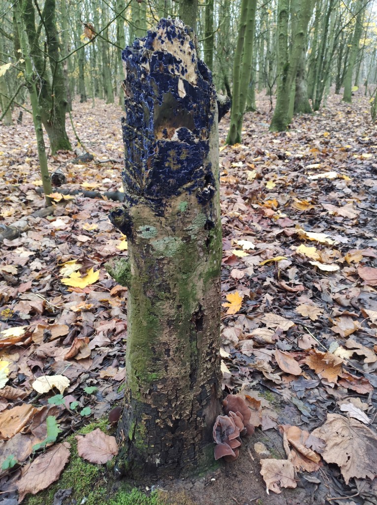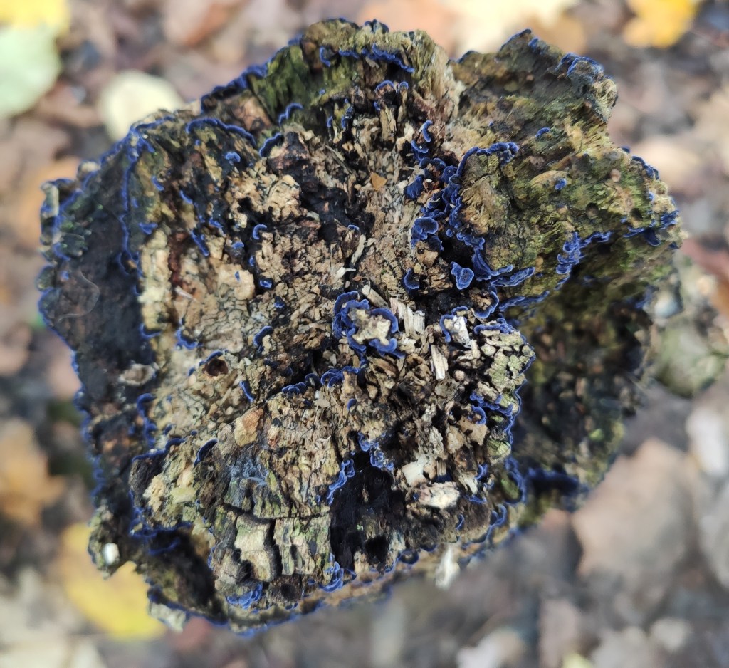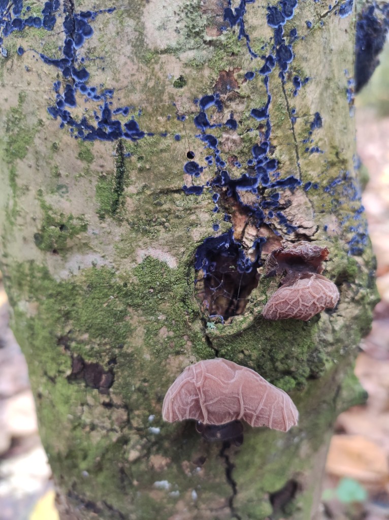 At almost the end of a delightful walk spotting fungal treasures in a deciduous wood on a rewilded old train track in Bilsthorpe, rural Nottinghamshire, I spotted some lovely Auricularia auricula-judae (wood ears) on a gnarly, jaggedy, tall stump of a tree. I then looked up and wondered how I could have missed the most incredible, midnight blue covering almost half of the wood. In my excitement at my new discovery, my photographs came out a little unfocused.