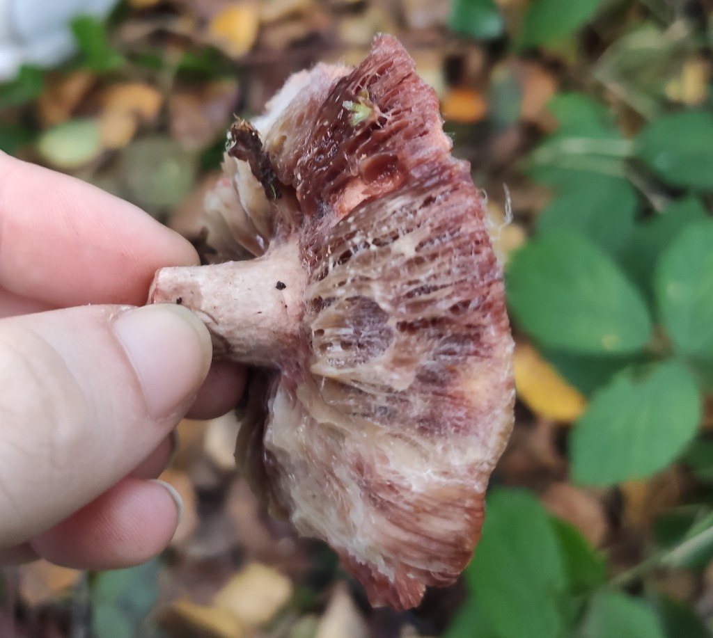 Gills: Lilac, sinuate (wavy), crowded. Turning brown-ish when mature.