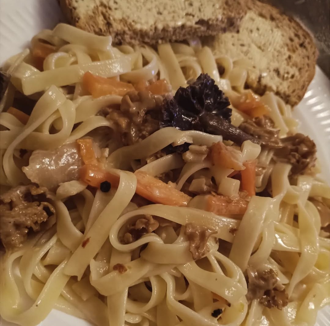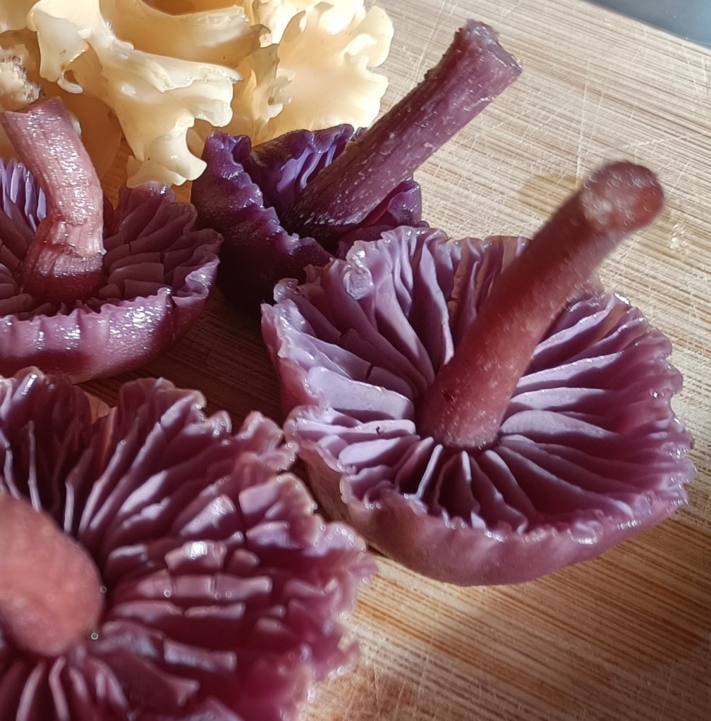 Amethyst Deceivers are known as an edible species, though they are described variably as having a non-distinct taste to having a mildly mushroomy/nutty taste. They retain their colour when cooked making them a great aesthetic addition to dishes. When trying foraged fungi for the first time, I proceed with caution and sauté in vegan butter first instead of diving into more complex recipes. This is so that I can both taste the fungi on their own and check if I have any adverse reactions. I find they have a definite but subtle mushroomy taste. I pickled some with cauliflower mushroom to preserve them, and used them in a creamy vegan tagliatelle dish inspired by a recipe from Wild Food UK. Yum.