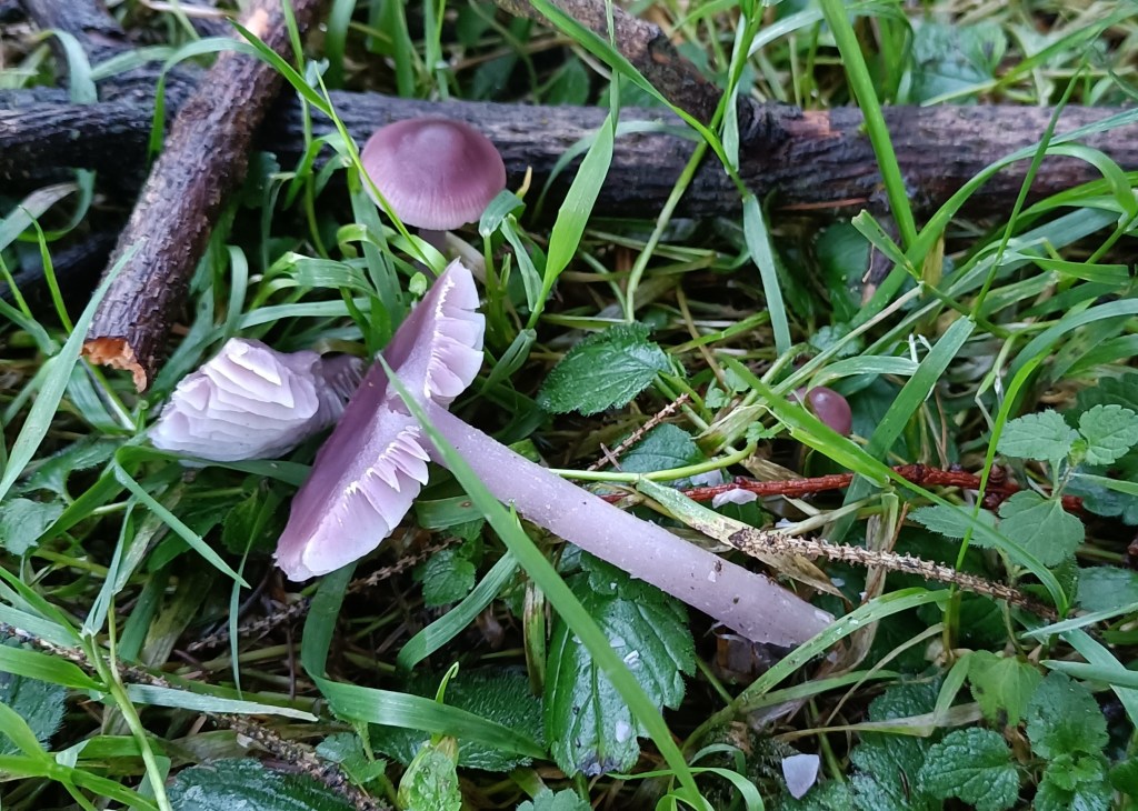 Lookalikes: Other purple fungi including Mycena pura – lilac bonnet – but the stipe is not fibrous. Inocybe lilacina – Lilac fibrecap is lilac but can be distinguished as the caps are made of fibres that radiate from centre, the edges of the cap are often split, and the spores are brown.